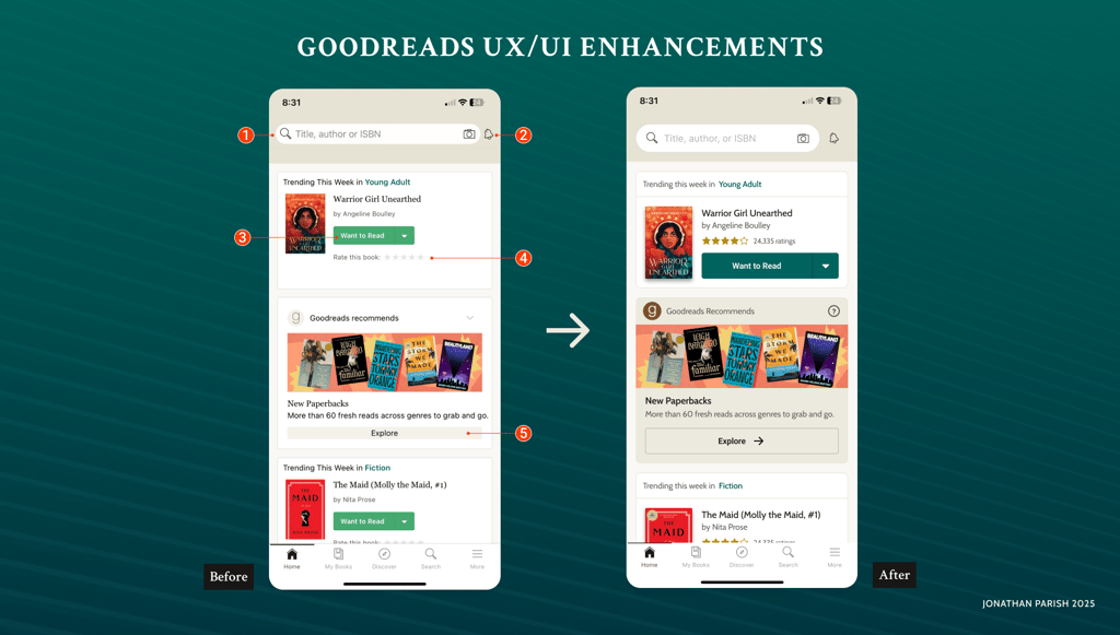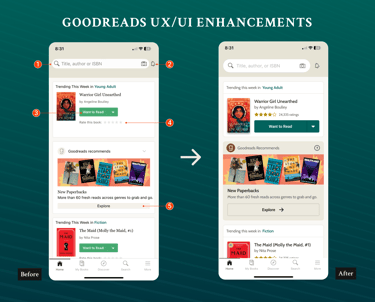 These improvements enhance the usability and accessibility of the Goodreads app, making interactions smoother and more intuitive while maintaining brand consistency.