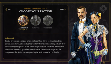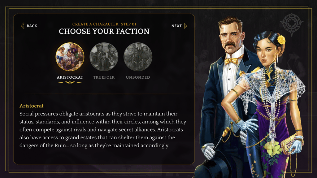 As you begin to create a character, the first thing you do is select a faction that you will be playing as. Your choices as a player are Aristocrat, Truefolk, and Unbonded. Each faction has unique background information that you can use as you begin roleplaying.