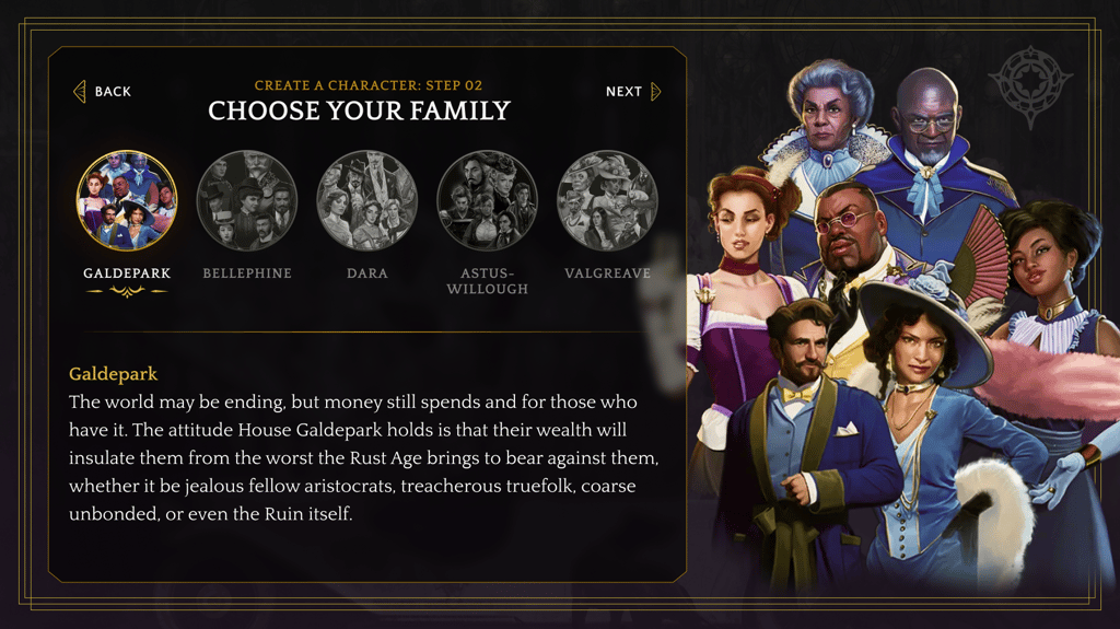 Our Brilliant Ruin is a table-top role-playing game by Studio Hermitage set in a world that combines Edwardian-style upstairs-downstairs sociological drama with apocalyptic horror. Like most RPG's, one of the first tasks as a player is to create a character. Creating a character is one of my favorite steps in playing TTRPG's, so I naturally gravitated towards this particular flow.
