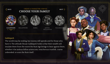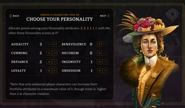 For the purposes of this design exercise, I selected the Aristocrat faction. There are more steps to the character creation process, but here's what I've designed so far: